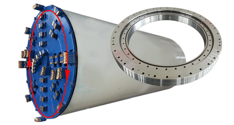 頂管機主要由旋轉挖掘系統、主頂液壓推進系統、泥土輸送系統、注漿系統、測量設備、地面吊裝設備和電氣系統等組成。我公司生產的頂管機專用三排圓柱滾子轉盤軸承(回轉支承)用于旋轉挖掘系統中的切削刀盤。